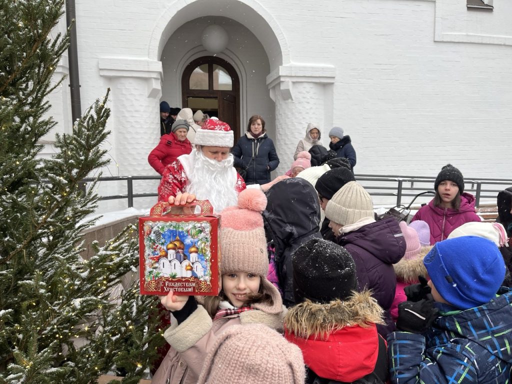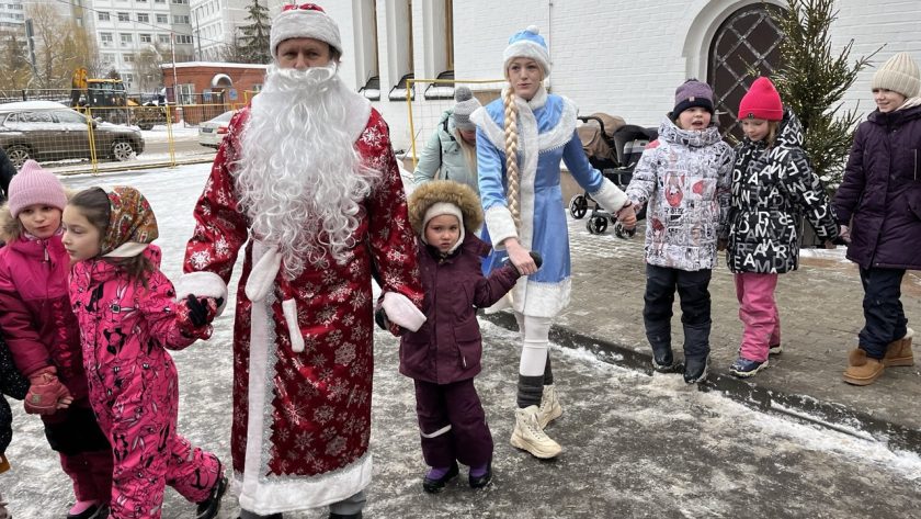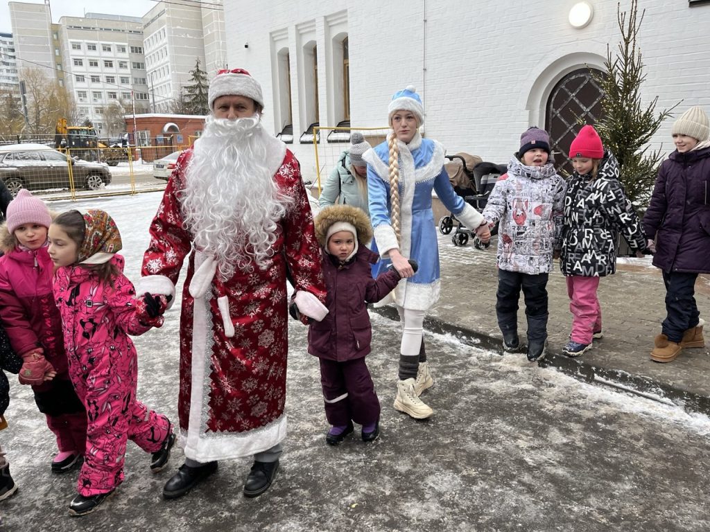 На улице маленьких прихожан ожидали главные герои нового года — Дед Мороз и Снегурочка. Дети рассказывали стихи, водили хороводы.